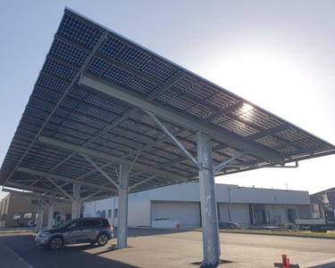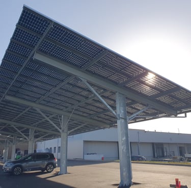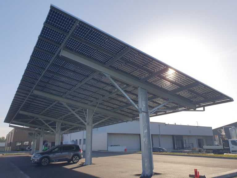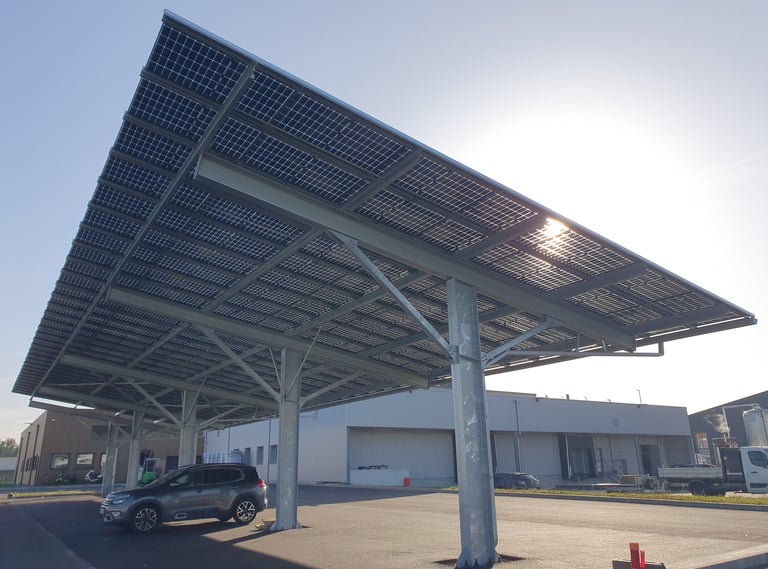 Une ombrière a été installée sur le parking des employés dans le cadre de la construction d'une nouvelle usine agroalimentaire. La Charcuterie Cosme est propriétaire de l'ombrière et autoconsomme la totalité de la production électrique.