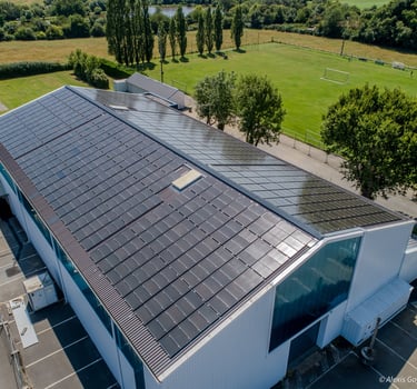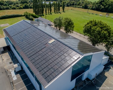 Installation en toiture d’une centrale photovoltaïque pour laquelle l’intégration paysagère sur plusieurs pans de la salle de sport de la commune fut minutieusement réfléchie.