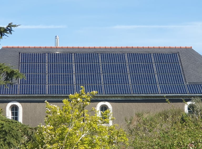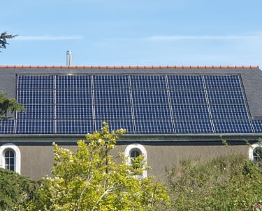 Installation de 26 modules intégrés à la toiture d'une maison d'habitation. Les modules assurent eux même l'étanchéité de la couverture en remplaçant les ardoises.