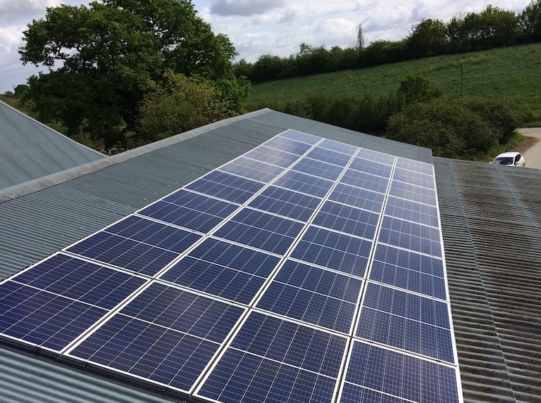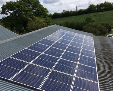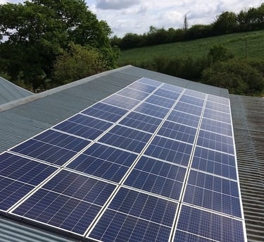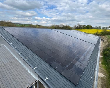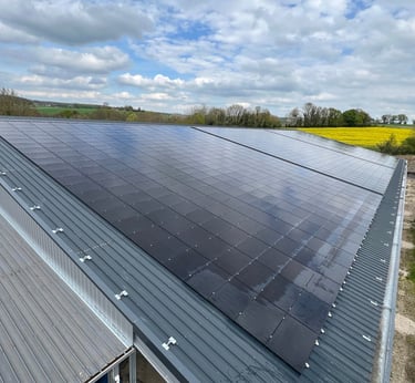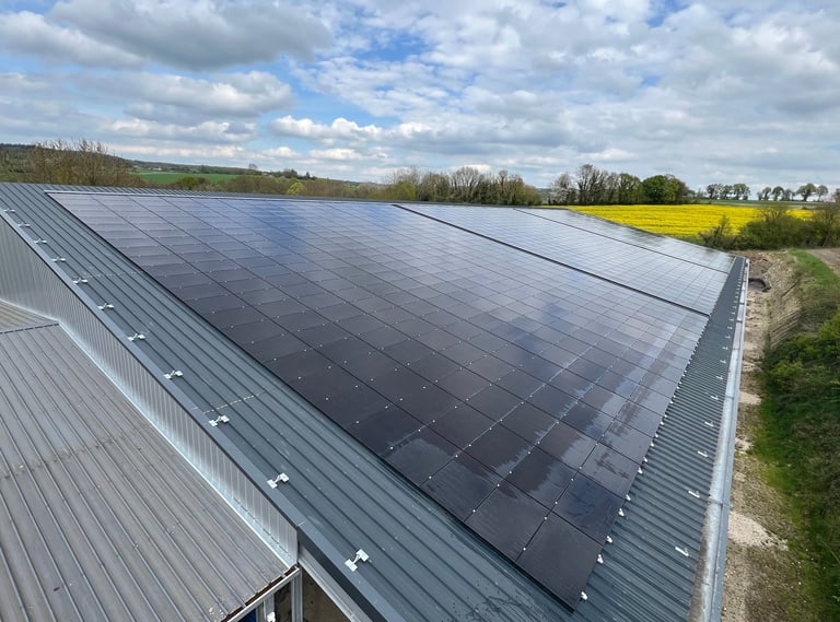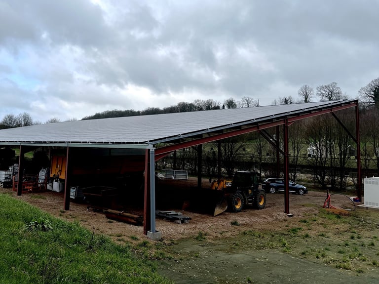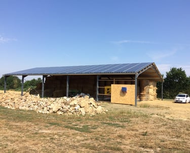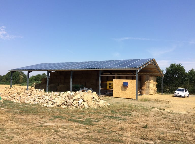 Installation d'une centrale photovoltaïque sur un hangar agricole existant ayant démontré via une étude de structure sa capacité à supporter le poids additionnel des modules photovoltaïques et du système d'intégration.