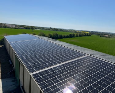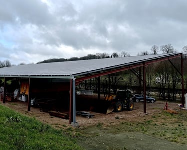 Centrale photovoltaïque installée lors de la construction d'un nouvel hangar agricole. La prise en compte des caractéristiques d'une centrale photovoltaïque dès la conception d'un hangar permet d'optimiser le projet global.