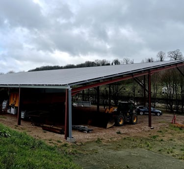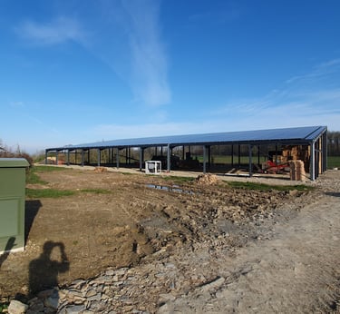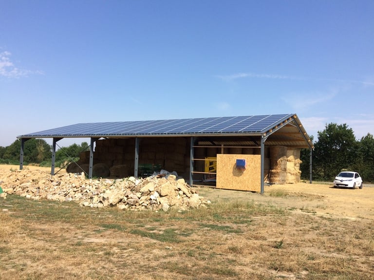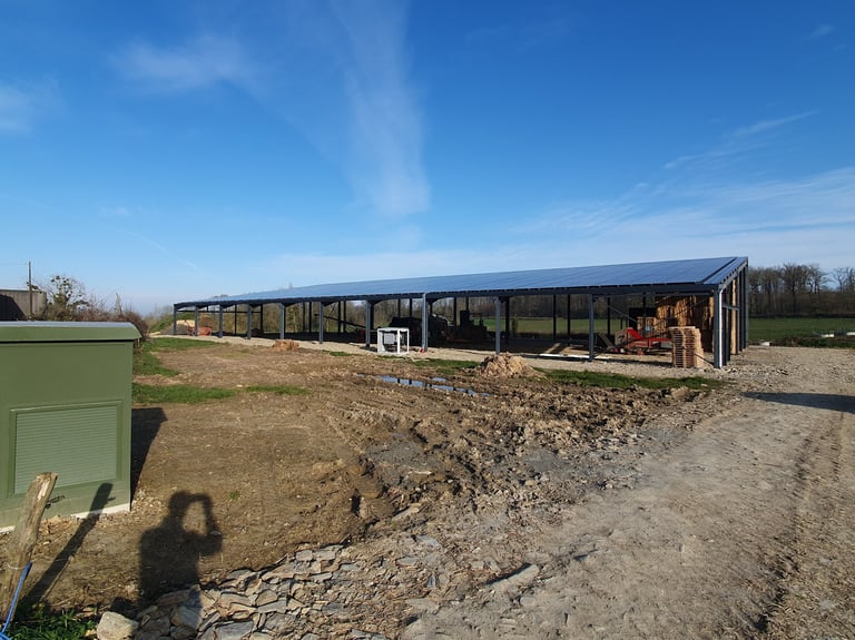 Afin d'anticiper une extension d'activité, un hangar agricole a été mis sur pied à proximité des bâtiments existants de l'exploitation agricole à Treil Bois. La toiture a été dimensionnée pour accueillir 294 kWc de panneaux photovoltaïques destinés à produire de l'énergie renouvelable directement injectée dans le réseau.
