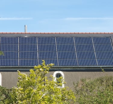 Installation sur le pan Sud du bâtiment composé en deux parties. La forte pente permet une production optimale.